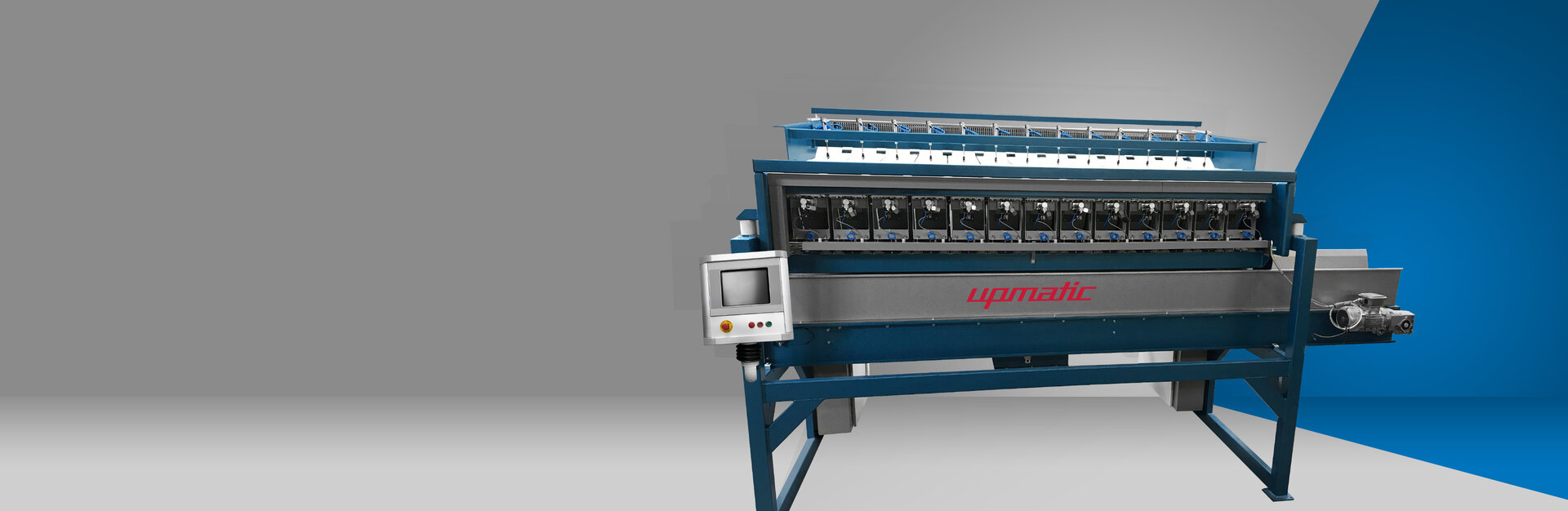 Unsere upmatic 2013HD ist eine unglaublich effiziente, computergesteuerte Teilmengenwiegemaschine, die allen anderen sprichwörtlich davonläuft. Das Erfolgsgeheimnis dieser Waage liegt in einer leichten Schrägstellung des Verteilersystems. Denn genau durch eben dieses Schrägstellen des Verteilersystems, welches aus zwei Vibrationsplatten besteht, gelangt das Produkt wesentlich schneller über die Vibrationsförderrinnen in die vorgesehenen Wiegebehälter. Um eine präzise Ermittlung der Teilmengen stets zu gewährleisten, ist jeder Wiegebehälter mit einer Wägezelle ausge- stattet. Sobald ein Teilgewicht in einem der dreizehn Wiegebehälter erreicht ist, wird die entsprechende Vibrationsförderrinne sofort ausgeschaltet und durch eine Absperrklappe verschlossen.